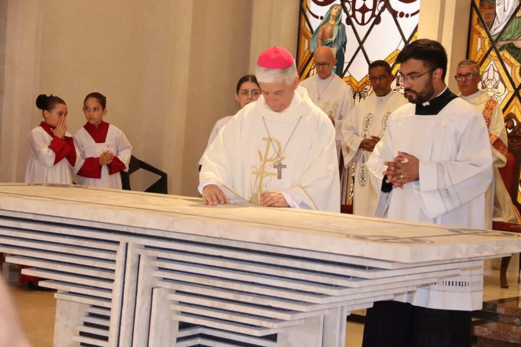 O rito de consagração do altar, um dos momentos mais significativos da tradição litúrgica da Igreja Católica, simboliza a dedicação definitiva do espaço sagrado para a celebração da Eucaristia. Durante a cerimônia, foram realizados ritos próprios, como a unção do altar com o óleo do Santo Crisma, o incensamento e a iluminação, expressando a centralidade do altar como sinal de Cristo e coração da vida litúrgica da Igreja.